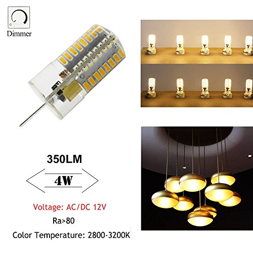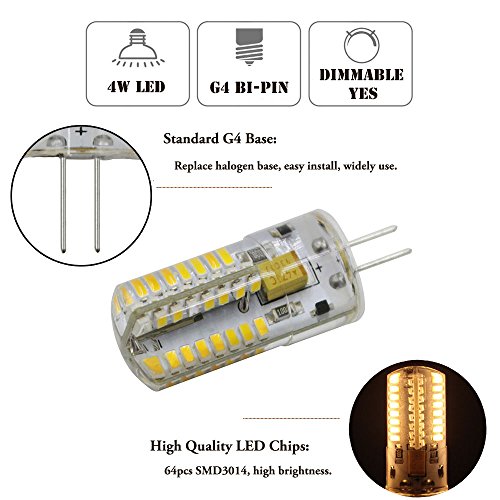 - √● HIGH PEFORMANCE: AC/DC 12V output, Dimmable bulb with G4 base,SMD3014 64 LEDs, can reach 290-350 lm