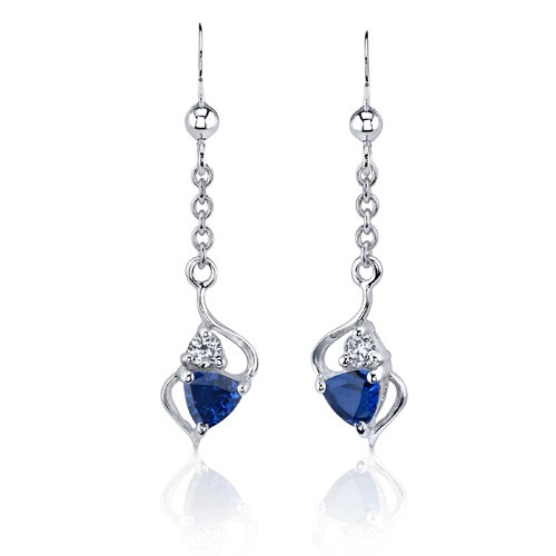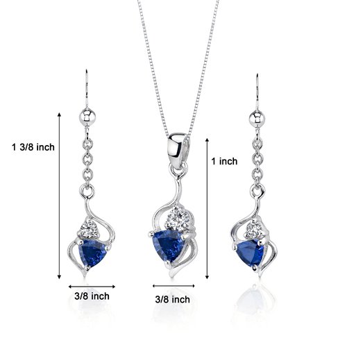 Gemstones: Lab Created Sapphires, Trillion Cut, 2.25 carats total gem weight. Sapphires have a deep Ceylon Blue Hue, Brilliant Sparkle and Clean Clarity. Pendants and Earrings are made from Sterling Silver Rhodium Finish with a total metal weight of 4.10 grams. The set has a CZ accent and feature top quality craftsmanship with Rhodium Finishing. Set includes a 18 inch Sterling Silver Rhodium Finish Box Chain and Designer Gift Box. Perfect gift for Christmas, Mothers Day, Valentines Day, Birthday, Graduation, Bridesmaids Jewelry. Style SS3178Feature