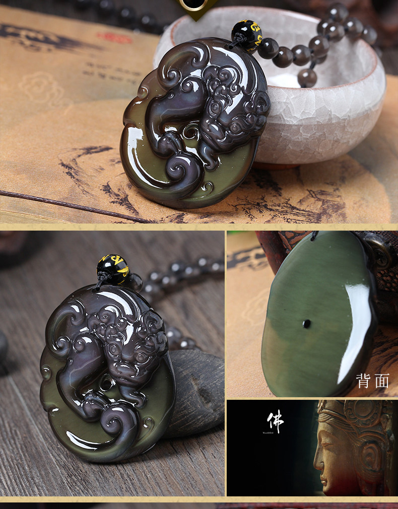 开光天然冰种彩虹眼黑曜石如意貔貅黑曜石丑贺金壁吊坠