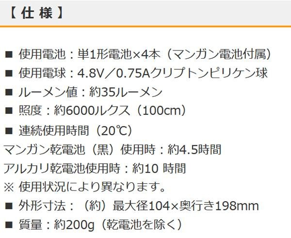 fk094igrjsマンガン単1形電池が4本付属明るいクリプトン球を使用した強力ライトです サイズ 個装サイズ:13×31×10.5cm 重量 個装重量:600g 生産国 中国 明るいクリプトン球を使用した強力ライト マンガン単1形電池が4本付属明るいクリプトン球を使用した強力ライトです