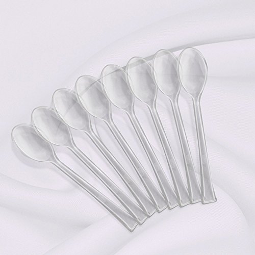 - PACK INCLUDES: 96 mini clear plastic spoons, measures 4.5 inches. Add some STYLE and CLASS to all of your parties and events with these high quality disposable mini clear dessert / appetizer spoons.