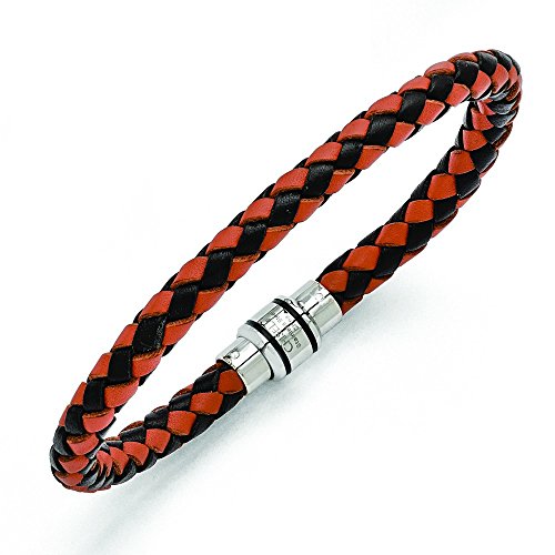 -. Title : Stainless Steel Polished Black Ip Black Orange Woven Leather Bracelet - 9 Inch