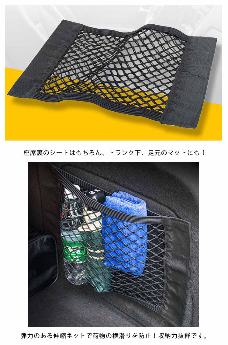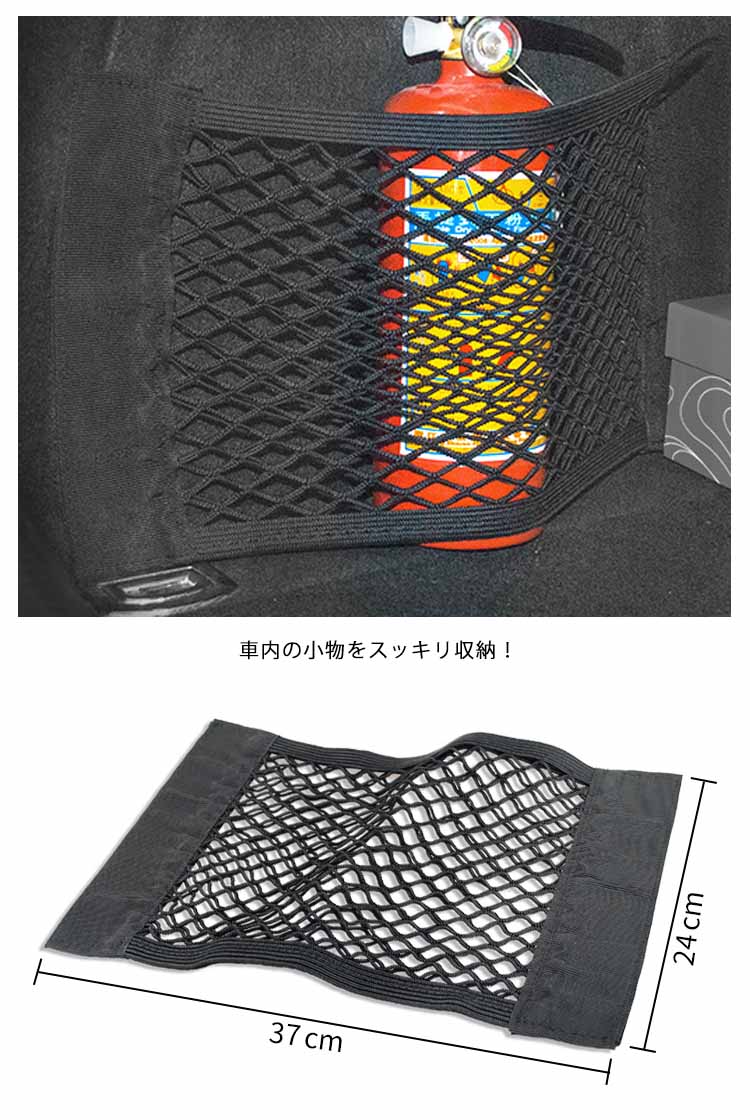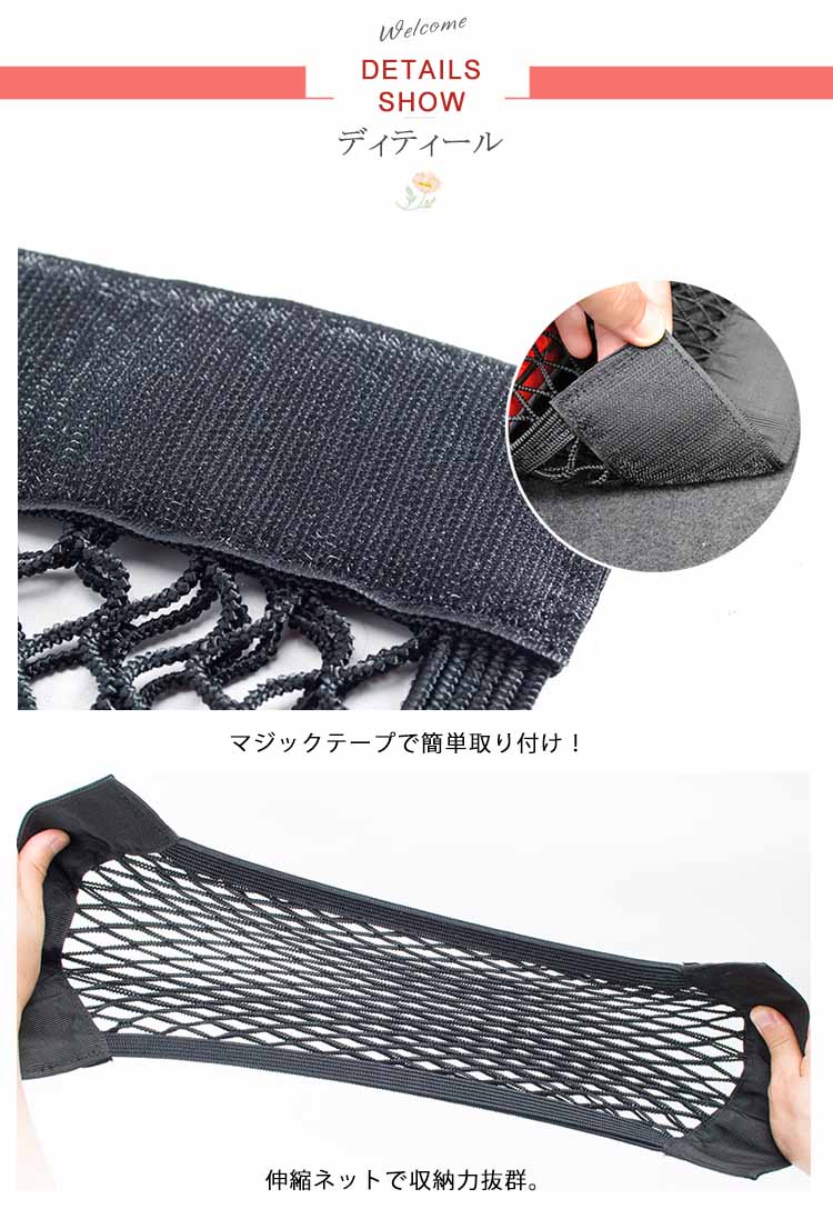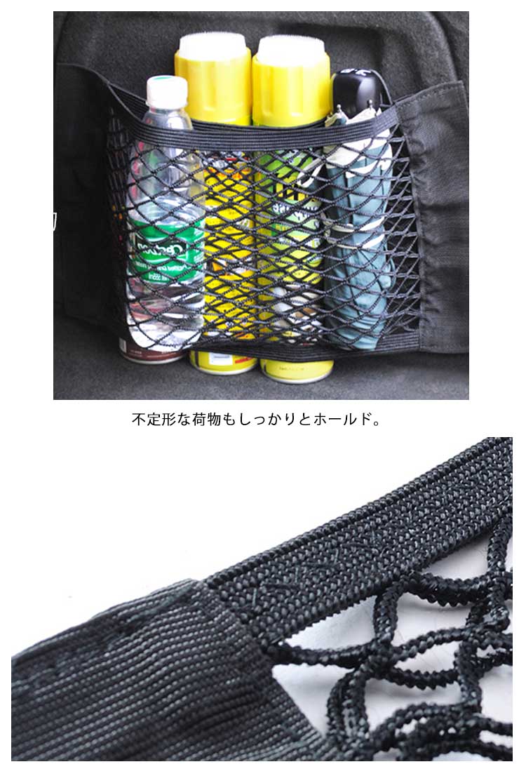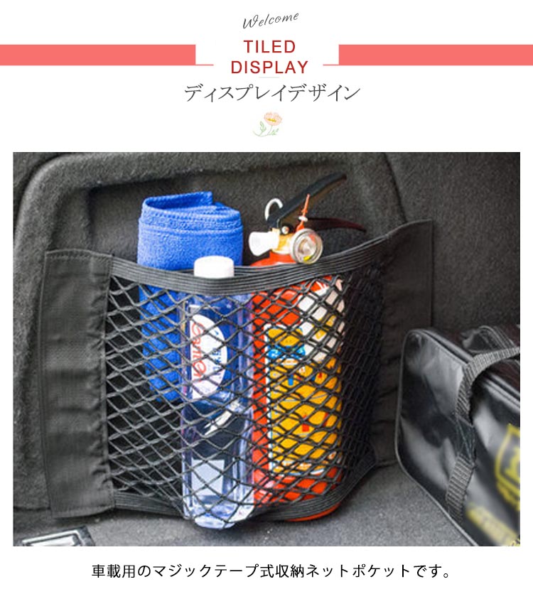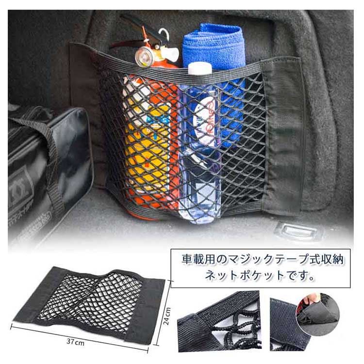 | 車載用のマジックテープ式収納ネットポケットです。座席裏のシートはもちろん、トランク下、足元のマットにも!弾力のある伸縮ネットで荷物の横滑りを防止!収納力抜群です。車内の小物をスッキリ収納! | |
