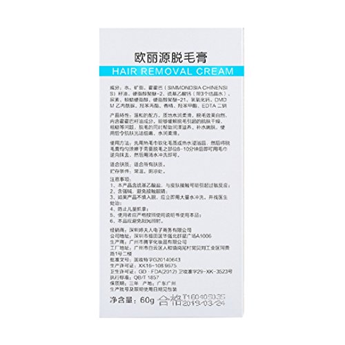 Suitable: for men and women Efficacy: New formula quick result Usage Instruction: use warm water to clean the areas to be treated, and then dry it carefully . Then spread this product evenly over teh areas ( usually takes 3-10 minutes, according to the differeces of compliance and amount) and then use a paper or wet towel to wipe the cream off. Caution: * Do not immediately use contain alcohol elements of excitant beauty products or exposure to the sun. * Do a patch test before applying the hair removing cream. If you are skin allergy, please stop useing it. * Do not use teh product on irritated or broken hair. * Avoid contact with mucous menbrances or very sensitive areas . * Avoid using alcohol-based cosmetics or exposed to sun immediately after epilation * to ensure that the hair removal effect prevent drug failure, after use should be sealed, avoid light preservation 0