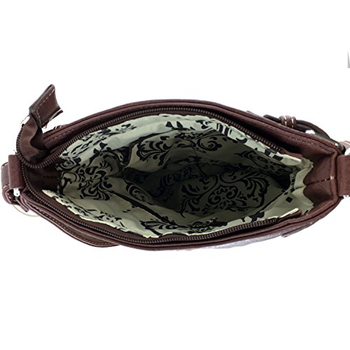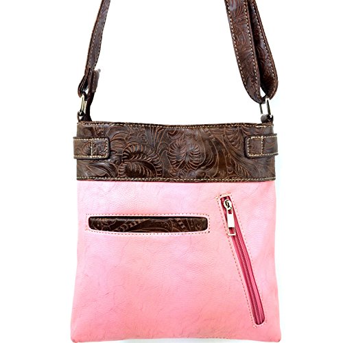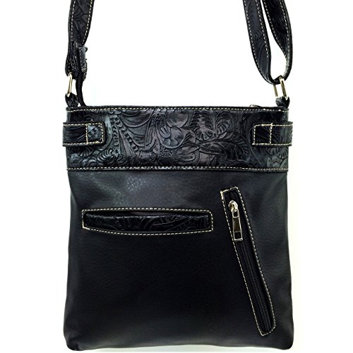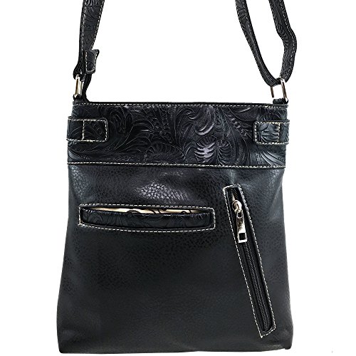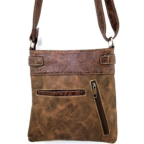 -. Feature : Handbag Measurements: 11" X 11" X 2" / Beautiful Artisan Laser Cut Design with Silver Cross Embellishment / Features Spacious Interior / Back Concealed Carry Pocket and Phone Slot Pocket / Adjustable Cross Body Strap