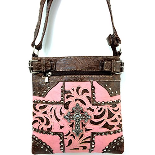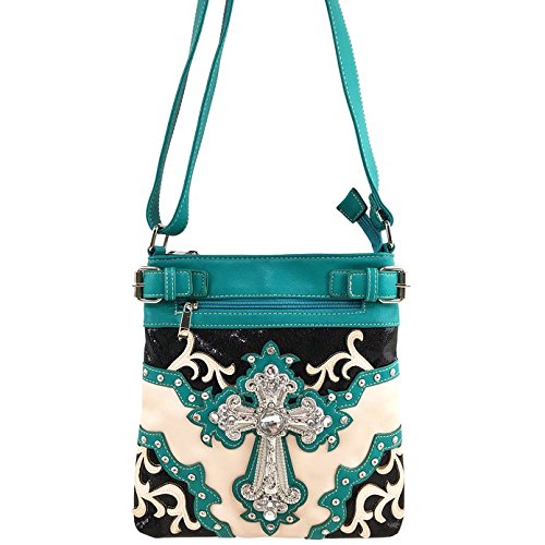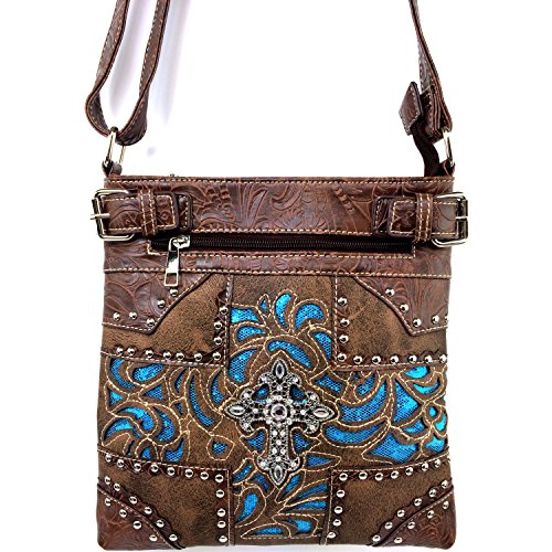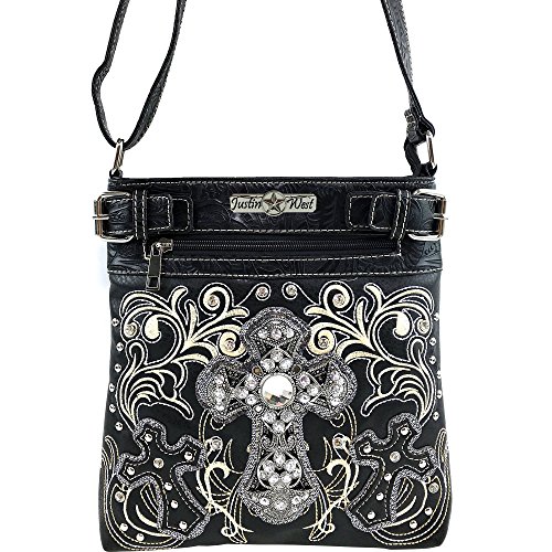 -. Title : Justin West Western Laser Cut Rhinestone Silver Cross Messenger Handbag with CrossBody Strap
