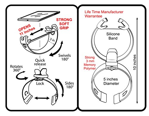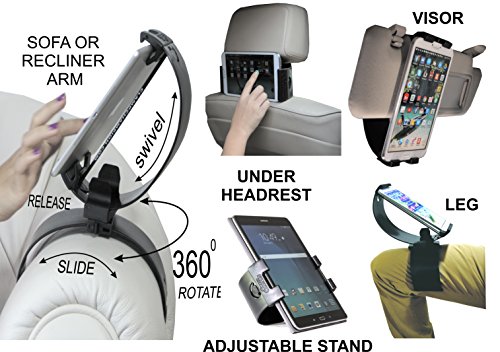 -. Feature : FROM CAR to COUCH to KITCHEN to SCHOOL -Its Strong Safe Grip rotates 360º with 160º swivel. Holds Big and Small Tablets & Smart Phones. Firmly Grips all size iPads, iPhone and all size Tablets and Smart Phones from 2 inches to 12 inches. Its Strong Grip keeps your Device Secure. It comes with a Life Time Manufacturer Replacement Guarantee. We want 100% Satisfied Customers / MOUNTS IN CAR Glove Box, Headrest, Visor & with Leg mount feature. It comes with a quick release so you can use the upper clamp separately in Stand Alone position or mount under headrest or on visor or hold it in your hand. / MOUNTS ON COUCH and recliner arm rest and back rest. Holds all Tablets and phones with cases. No need to take your case off. It also mounts on Airplane magazine rack, on the Train, Bus Seats. / MOUNTS IN KITCHEN on Cabinets, Drawers or in in Stand alone position. You can adjust the angle by sliding it up and down. Use in Bedroom by mounting it to a pillow. / IN SCHOOL AND OFFICE It holds hard back books. It can be used on a School Desk, in "Stand Alone" position. Why buy many holders when Clamp Champion works virtually every where. Thank you for your purchase. You can decorate and customize the Clamp surface with stickers. Plus % of your purchase helps charity.Designed & PATENTED in USA. Sold by USA Manufacturer helping produce jobs.