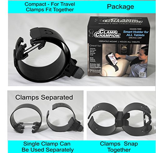 -. Title : Clamp Champion Fits All Tablets & Smart Phones- Mounts to Sofa, Bed, Car, Leg, Kitchen, School, Plane, Visor, Glove Box