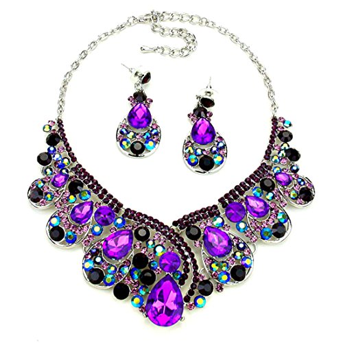 Elegant costume jewelry purple and ab rhinestone crystal silver chain statement Necklace Pierced post earrings set