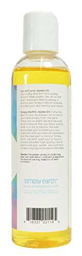 -. Binding : Health and Beauty -. Brand : Simply Earth -. EAN : 0816337021195 -. Feature : 100% Pure Jojoba Base or Carrier Oil / Botanical name: Simmondsia chinensis | Extraction: Cold-pressed from Jojoba seeds. | Absorption: Jojoba creates a barrier, but will leave a satiny finish. / Perfect carrier oil for creating your own essential oil blends. / It is very similar to sebum, the skin's natural moisturizer. / 13% of profits go to help end human trafficking. -. IsAdultProduct : 0 -. Label : Simply Earth -. Manufacturer : Simply Earth -. PackageQuantity : 1 -. ProductGroup : Health and Beauty -. ProductTypeName : HEALTH_PERSONAL_CARE -. Publisher : Simply Earth -. Size : 4oz -. Studio : Simply Earth -. Title : Simply Earth's 100% Pure Jojoba Oil - 4 oz -. UPC : 816337021195