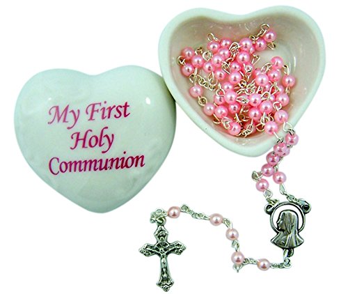First Communion Porcelain Heart Rosary Keepsake Box with Pink Rosary, 2 1/2 inches