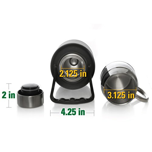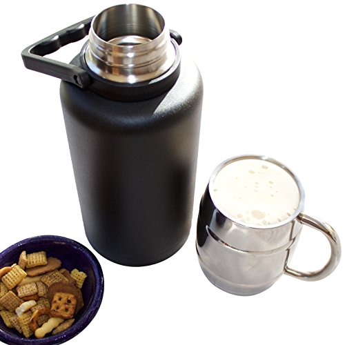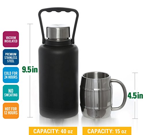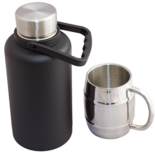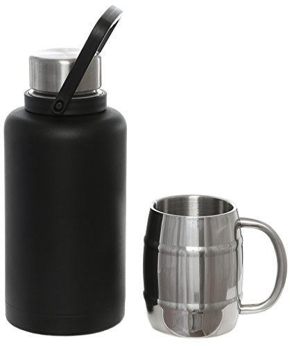 -. Feature : VACUUM INSULATED BOTTLE: Double walled, vacuum insulated bottle is made with high quality 18/8 stainless steel and is BPA free. The Stainless Steel will not break like your glass growler might. No, this isn't just a thermos for adults. A large 40oz capacity and ringed handle create a classic, yet updated growler look, while premium temperature lock technology gives this piece main edge. / DOES NOT SWEAT: Large (40 oz) premium stainless steel vacuum insulated bottle is powder coated that will not scratch easily. The 15 oz double walled mug is made from premium stainless steel. Keep your drinks hot or cold in the container and while drinking from the double walled mug. The bottle will not sweat outside. / BONUS MUG ($12 value!): Double walled 15 oz mug is made with high quality stainless steel. Keeps your beverage hot or cold for hours. Easy to wash in dishwasher. / MULTIPLE USES:. Use for Take it to go Beer: Fill the reusable growler at your favorite brewery . An air-tight, screw-on seal locks in carbonation to ensure that your beer tastes great all day long. Use for soda, coffee, juices, hot chocolate - 40 oz capacity chamber holds enough drink for a crowd. If you're not into ale, how about a steaming hot cocoa, or a cup of coffee? / WIDE MOUTH: For easy filling, pouring, drinking, and cleaning. Multiple uses - Beer Growler, Cold Drinks, Steaming Hot Beverages. No matter what you are thirsty for, it'll taste exactly as it should when you are ready for a treat.