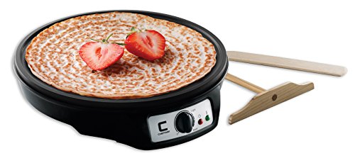 Enjoy consistently easy and delicious breakfast using The Chefman Electric Griddle & Crepe Maker - every brunch lover's dream. With multiple functionalities, you can make crepes, blintzes, pancakes, eggs, bacon, and many more breakfast delights! No more half-baked crepes or over-done pancakes. This crepe maker has a powerful 1200 Watt heating element that heats up your crepe pan quickly, while precise temperature knob makes it easy to make your breakfast exactly how you want it. Red light indicator lets you know when the crepe pan is on, while the green light indicates when the desired cooking temperature has been reached. With a large cooking area, it is easy to create restaurant-style crepes - your family and friends won't believe it's homemade. Simply preheat the crepe maker, spread a thin layer of batter, and watch your crepe cook in seconds. Includes wooden batter spreader and spatula for perfect distribution, giving you precise results every time. Non-stick aluminum surface cleans as easily as it cooks. With the advanced safety technology for long-lasting durability, 30 Day No-Questions-Asked Money-Back Guarantee, & 1-year hassle-free warranty, as well as exclusive access to Club Chefman for creative recipes, guided tutorial videos and more, making crepes has never been so easy!Feature