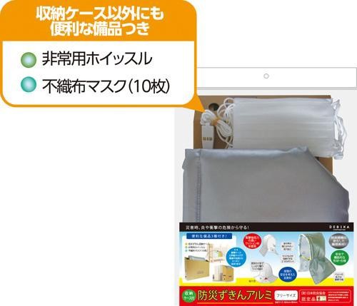 | 素材・材質 | 【防災ずきん】 表地:ポリエステル(難燃アルミ加工) 裏地:アクリル系難熱加工材 芯材:ポリエステル(難燃加工) 反射材:PVC ゴムバンド:ポリエステル ゴムバンドストッパー:ABS 【収納ケース】 紙 【非常用ホイッスル】 本体/ABS、ヒモ/ナイロン 【不織布マスク】 本体/PP不織布 鼻あてワイヤー:アルミ、PP 耳かけゴム:天然ゴム |