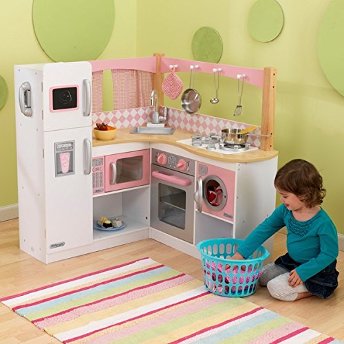 -. Feature : Dishwasher, oven, microwave, refrigerator and freezer doors all open and close Cloth curtains behind the sink Color: Pink/white Dimensions: 36 inches long x 36 inches wide x 35.5 inches high Materials: MDF, plastic, fabric Care instructions: Wipe with damp cloth Brand: KidKraft