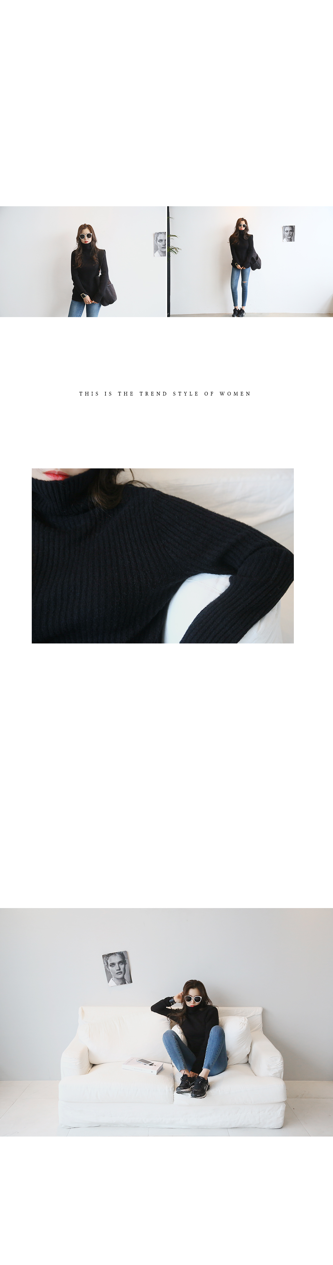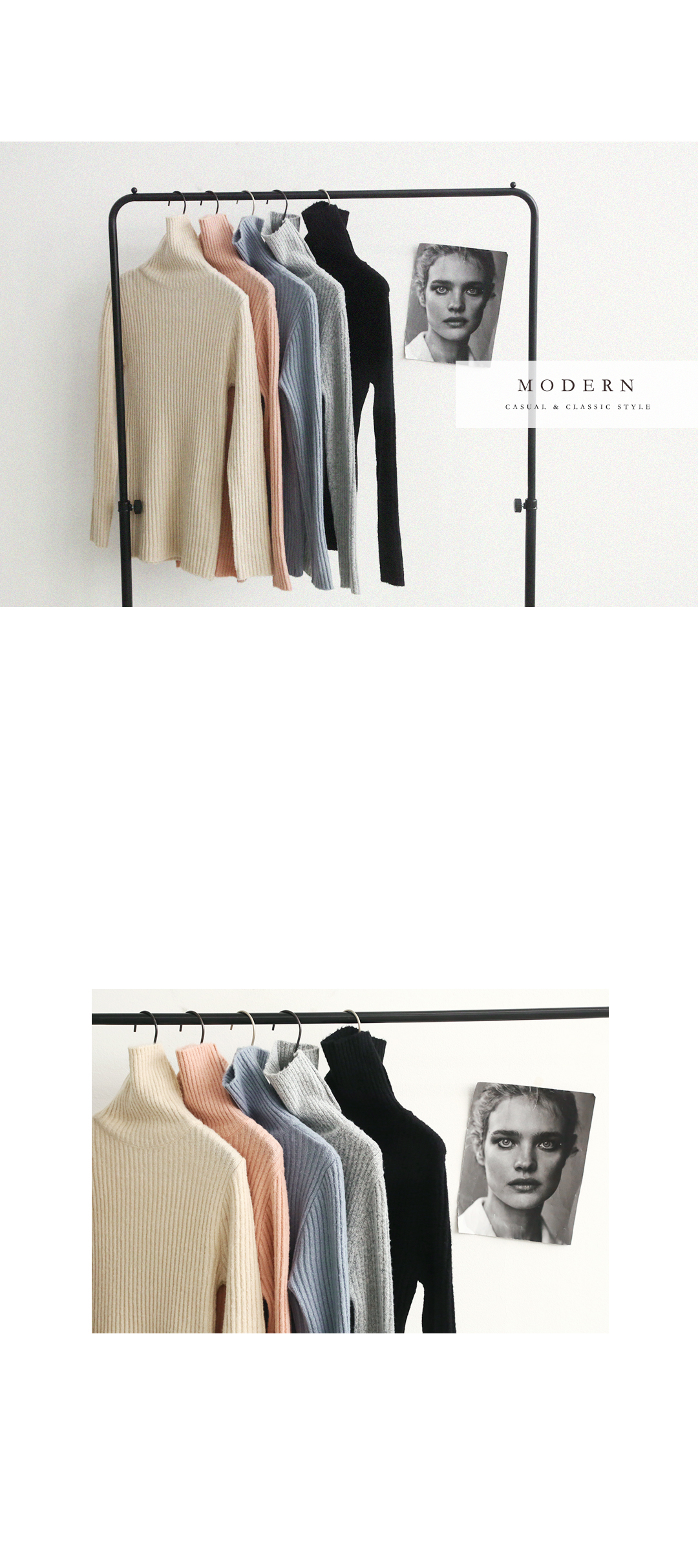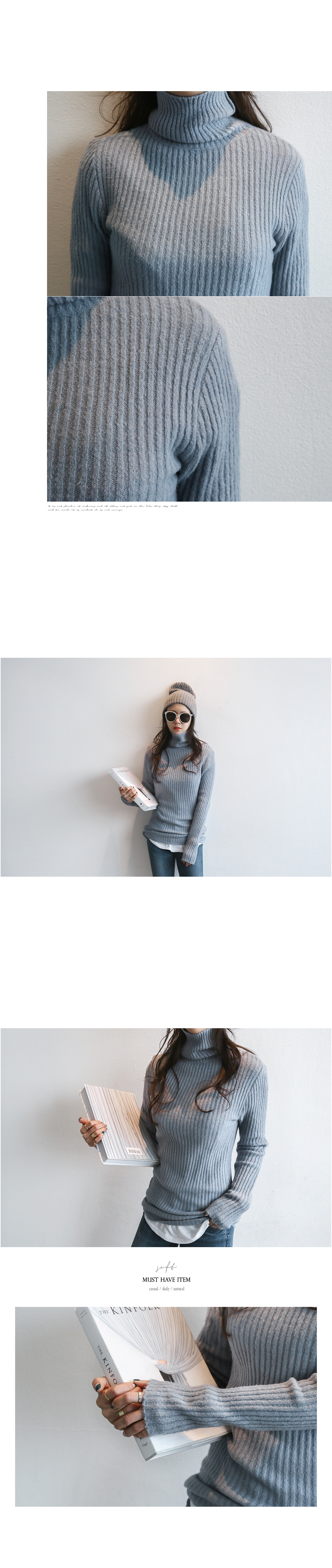 소장하시면 자꾸만 손이가게 되는 폴리니트 소개해드릴께요.심플한 디자인과 굵직한 골지짜임으로 모던하고 은은한 분위기의 제품인데요~ 신축성이 정말 좋아 편안하고 부드러운 착용감을 느끼실 수 있구요.바디실루엣에 맞춰 자연스럽게 핏 되는 사이즈로 여성스러우면서도 슬림해보이는 효과를 줍니다.군더더기 없는 디자인으로 유행타지않고 즐겨입으실 수 있으며스타일링이 용이해 데일리아이템으로도 활용도가 높은 아이템입니다.