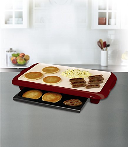 This Oster CKSTGRFM18MR-ECO DuraCeramic Griddle with Warming Tray is a unique candy apple red color. Unique and innovative Dura Ceramic non-stick ceramic coating, 4 times more durable; Won't flake or peel.