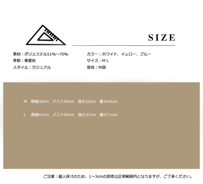 シフォンブラウス 長袖 レディース フォーマル トップス 大きいサイズ 無地 白 黒 シャツ ブラウス フォーマル 通勤 オフィス 2018春秋新作 シフォンブラウス フォーマル 大きいサイズ トップス 無地上品なシルエットで女性らしさたっぷりに仕上げましたブラウスです。シンプルに着こなしても、重ね着などで表情を出しても決まります。優秀ポイントが詰め込んだこれからの季節にぴったりなアイテムです。商品詳細素材:ポリエステル51%~70%季節:春夏秋スタイル:カジュアルカラー:ホワイト、イェロー、ブルーサイズ:M L産地:中国サイズ参照表M 肩幅38cm バスト90cm 袖丈55cm 着丈69cmL 肩幅41cm バスト94cm 袖丈57cm 着丈71cmご注意:個人採寸のため、1~3cmの誤差は正常範囲内となりますが、ご了承ください。シフォンブラウス 長袖 レディース フォーマル トップス 大きいサイズ 無地 白 黒 シャツ ブラウス フォーマル 通勤 オフィス 2018春秋新作 シフォンブラウス フォーマル 大きいサイズ トップス 無地