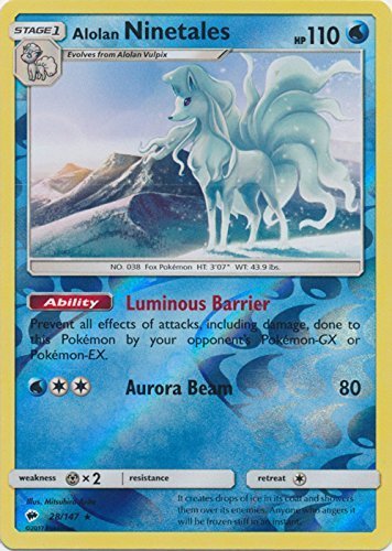 -. Binding : Toy -. Brand : Pokémon Company International -. EAN : 0617957143102 -. IsAdultProduct : 0 -. Label : Pokémon Company International -. Manufacturer : Pokémon Company International -. PackageQuantity : 1 -. ProductGroup : Toy -. ProductTypeName : TOYS_AND_GAMES -. Publisher : Pokémon Company International -. Studio : Pokémon Company International -. Title : Alolan Ninetales - 28/147 - Rare - Reverse Holo - Sun & Moon: Burning Shadows -. UPC : 617957143102