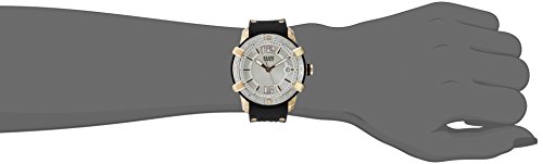 White mother of pearl dial with rose gold tone and white hands, Arabic numerals and hour markers; luminous; stainless steel bezel encrusted with 18 white diamonds (approx. 0.14 TCW) with black silicone rim and rose gold tone ion-plated stainless steel accents; rose gold tone ion-plated stainless steel crown with black silicone rim; sapphitek crystal; rose gold tone ion-plated stainless steel case; black silicone strap
