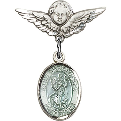 -. Title : Sterling Silver Baby Badge with Blue St. Christopher Charm and Angel w/Wings Badge Pin 7/8 X 3/4 inches