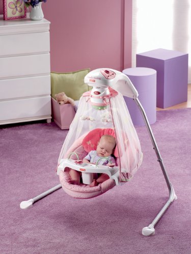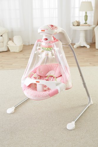 - Feature : Pink cradle swing with butterfly garden theme and light show / Soothes baby with the option to rocks both front to back or side to side / Six swing speeds and eight lullabies calm baby, preparing him for sleep / Can be plugged in to any standard wall outlet with included AC adaptor / Ships in Certified Frustration-Free Packaging / Easily folds up for storage