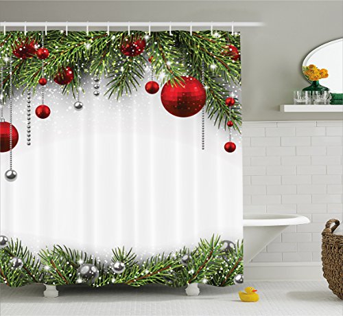 Merry Christmas Shower Curtain Bathroom Accessories by Ambesonne, Noel Backdrop with Fir Leaves Decorative Bright Balls Classic Religious Xmas Decor, Polyester Fabric Set with Hooks, Red Green