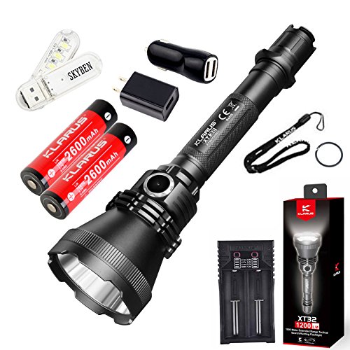 SKYBEN Klarus XT32 Kit 1200 Lumens CREE XP-L HI V3 LED 1000-meter Range Tactical Hunting Searchlight Super-bright Flashlight with Car Charger,Wall Adapter,18650 Battery x 2,Charger and USB Light
