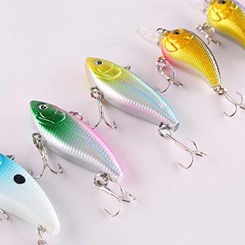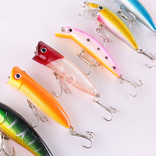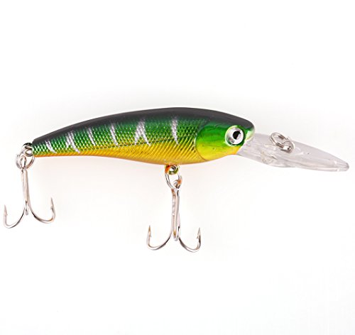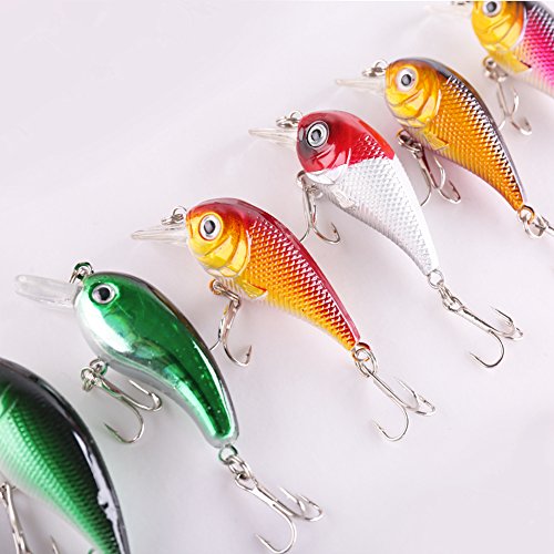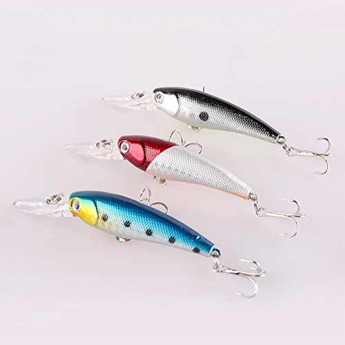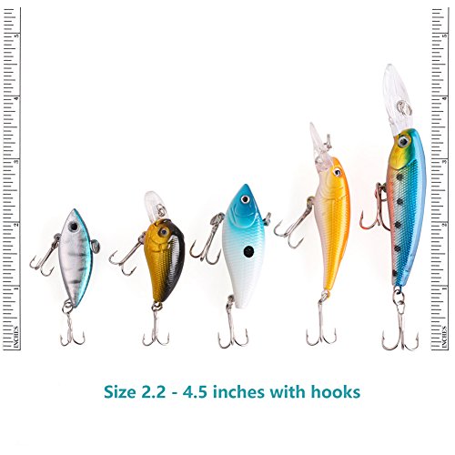 -. Feature : Bright colors to attract big fish / Each comes with 2 sharp treble hooks / Size: Each comes in a different size, from 1.57 to 3.66 inches in length (without hooks) / Material: PVC plastic, stainless steel / 1-Year Warranty: Money-back satisfaction guarantee
