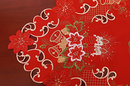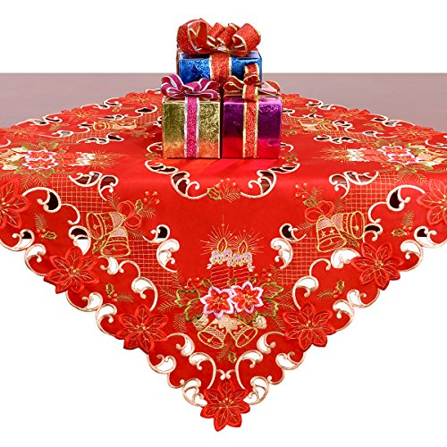 Small Christmas Tablecloth Embroidered Bells Candles and Poinsettia 33” X 33”
