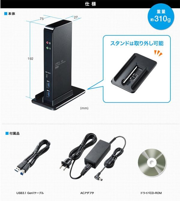 | USBケーブル1本でディスプレイ2台出力、有線LAN接続、USBオーディオ接続、各種USBデバイスの拡張接続ができるUSB3.1ドッキングステーションです。USBポートからのディスプレイ増設(HDMI×2)に対応しており、簡単にマルチディスプレイ環境(ミラーモード/拡張モード)を実現できます。 |