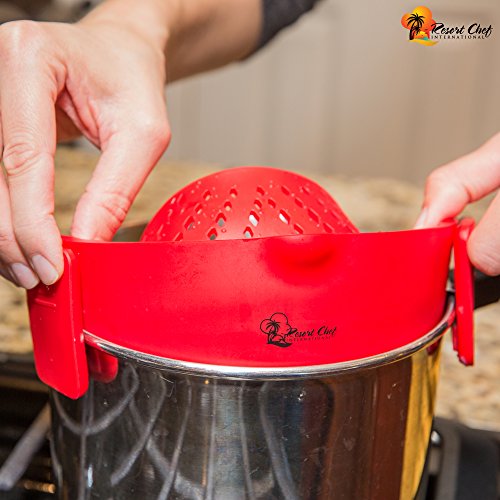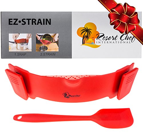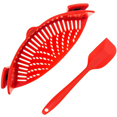 Latest Kitchen Red Clip-on Strainer. BEST for Straining Meat Grease, Pasta, Eggs, Rice, Fruits & Vegetables - BPA Free FDA Approved - Includes Bonus Matching Silicone Spatula - Makes a Great Gift!