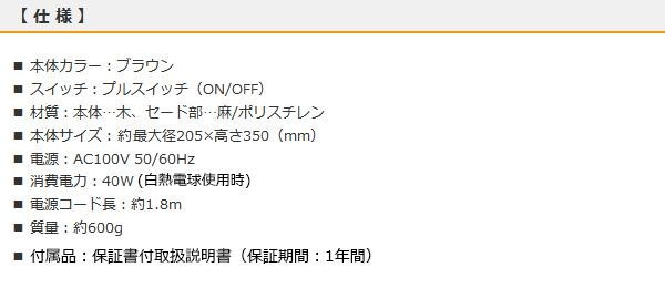 fk094igrjs木製のぬくもりある質感とシンプルなフォルムが、お部屋を落ち着きのある空間に演出します麻(外側のみ)のセードから、光がやわらかく広がります サイズ 個装サイズ:22×22×37cm 重量 個装重量:710g 製造国 中国 プルスイッチの懐かしいデザイン ※電球は別売です(使用電球/全長:120mm・最大径:60mm以下、口金:E26) 以下の指定以外の電球、特殊電球は使用しないでください 発火、発煙、火災の原因となります 【白熱電球】 40W以下を使用してください 【電球形蛍光灯】 10W以下を使用してください 【LED電球】 8W以下、質量110g以下を使用してください ※LED電球を使用する場合、広配光のタイプをお勧めします 木製のぬくもりある質感とシンプルなフォルムが、お部屋を落ち着きのある空間に演出します麻(外側のみ)のセードから、光がやわらかく広がります ご注文後3~4営業日後の出荷となります