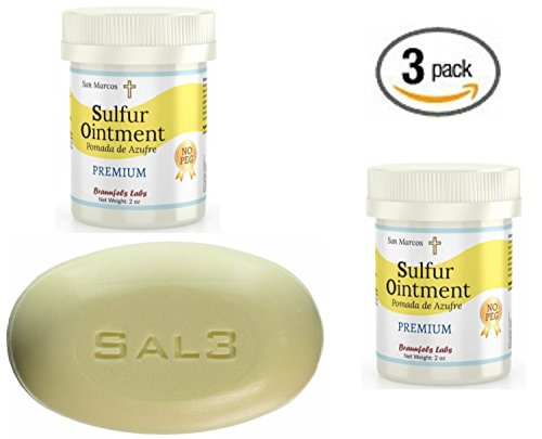 -. Feature : Amazon exclusive value package! Two jars of San Marcos 10% Sulfur Ointment + a 3.5 ounce bar of advanced SAL3 soap, with 10% sulfur and 3% salicylic acid - No perfume. / 10% Sulfur Ointment . Go All Natural ! --- Say 'No' to polyethylene glycol - PEG. / All natural. Expect the best! / No PEG (polyethylene glycol). / No artificial fragrance or dyes.