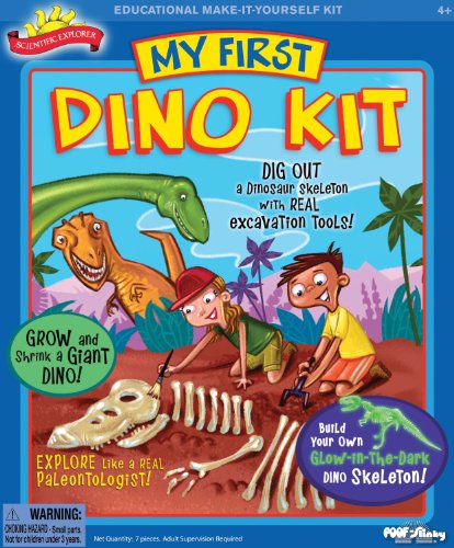 Studio : poof Publisher : poof Binding : Toy Product Description Explore like a real paleontologist using My First Dino Kit. Dig out a dinosaur skeleton with real excavation tools, grow and shrink a giant dino and build your own glow-in-the-dark dino skeleton. Children will become paleontologists-in-training as they lead their own dig. They will learn important observation skills and hand-eye coordination as they use excavation tools to explore a "dig it out" dinosaur block. Then kids can classify and display their findings. They'll learn anatomy as they put together a skeleton. My First Dino Kit is packed with dinosaur information that encourages critical and creative thinking. It is recommended for ages 4 and up, although adult supervision is required. Each kit comes with a brush, a chisel, a dinosaur block, a glow-in the dark dinosaur skeleton, a growing dinosaur, a pair of goggles, and an activity guide. 0