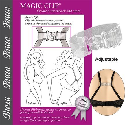 Magic Clip provides an instant breast lift and immediate relief. It shifts the weight and pressure off shoulders and redistributes it, giving a wonderfully healthy feeling. In some cases it may even help reduce or eliminate back pain and headaches caused by bra tug. Simply wrap around bra straps and clip. Slide the clip up and down until you have the best overall result. Adjust the length for individual comfort. Package contains one Magic Clip.Feature
