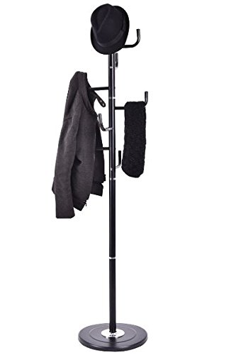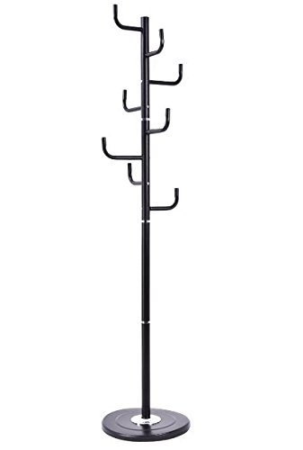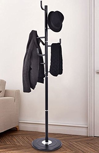 -. Feature : Great for hanging hats, coats, scarves, handbags, backpacks, towels and other clothing items / Round steel base filled with sand and stone for sturdiness / Totally 8 hooks bring plenty of stylish storage into your living space / Fine workmanship, stable and durable / Painted surface for rust-resistance