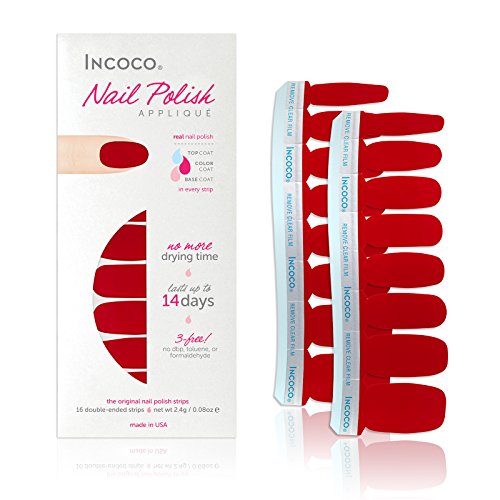 -. Binding : Misc. -. Brand : Incoco -. Feature : Nail polish strips made with 100% real nail polish / No more dry time, smears or smudges / Remove with regular polish remover / Includes 2 sheets with 16 total strips in varying sizes to ensure a perfect fit / Made in USA -. IsAdultProduct : 0 -. Label : Incoco -. Manufacturer : Incoco -. MPN : EMC004 -. PackageQuantity : 1 -. PartNumber : EMC004 -. ProductGroup : Beauty -. ProductTypeName : BEAUTY -. Publisher : Incoco -. Studio : Incoco -. Title : Incoco Nail Polish Strips, Nail Color, Passion