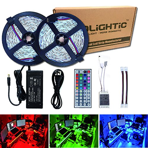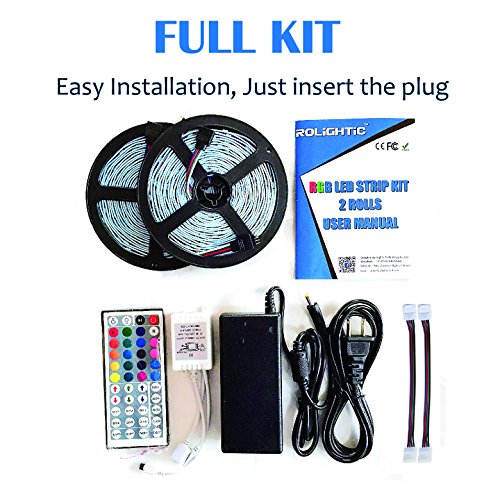 RoLightic Led Strip Lights Kit SMD 5050 32.8 Ft (10M) 300LEDs RGB Rope Lights with 44key IR Controller and 12V 5A Power Supply for Indoor Home Cabinet Bedroom Background Use