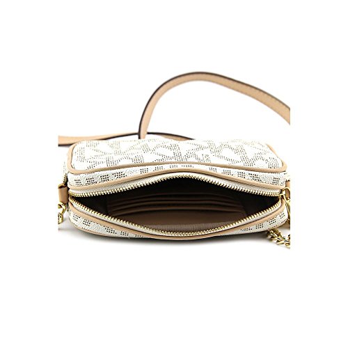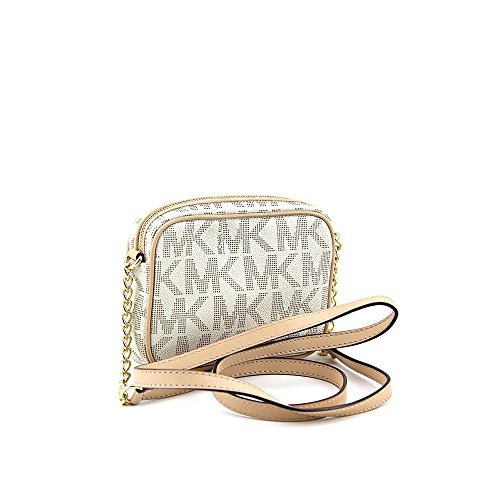You'll be exploring new heights in fashion with Michael Kors MK Logo cross-body bag! This compact gem is wrapped in MK block signature logo patterned PVC with leather trim and polished hardware. The top zip closure opens to a tone on tone MK logo print fabric lining and features an open slip pocket and 4 card slots. It is accented with Michael Kors engraved logo nameplate on the front. It has a single leather and polished chain shoulder and cross-body strap with a drop of about 23 inches, and measures approximately 6 inches (L) x 4.5 inches (H) x 1.5 inches (W).Feature