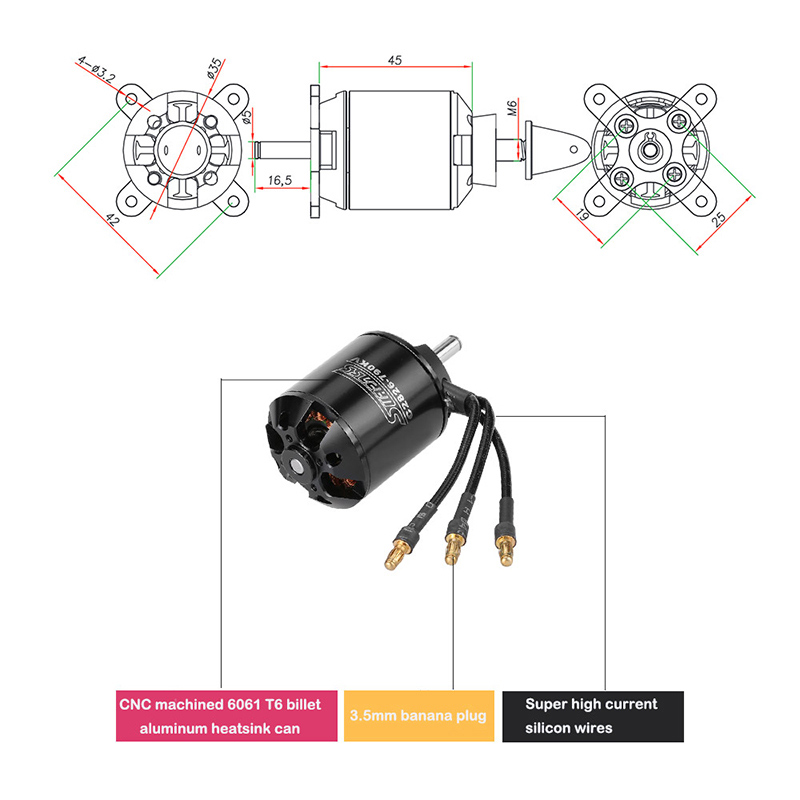 The original SURPASS 2826 790KV brushless motor is designed to provide both quality and performance at an affordable price. It is built from high quality aluminum alloy which is produced from the latest CNC milling machines, and is designed with high power and rotation speed to provide longer run time for RC airplane fixed-wing.