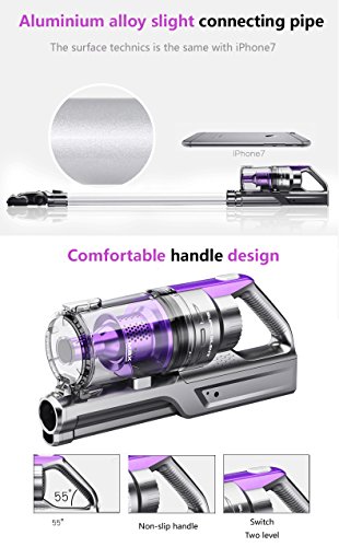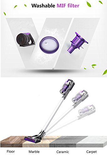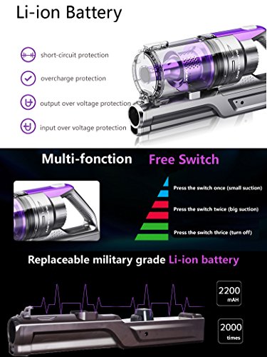 Product Features: Rechargeable & Replaceable Battery, 7 Kpa Strong Suction 22.2V 2200mAh Lithium ion battery has a high charging efficiency, environmental known as the green battery. And the Sentovac M-950 vacuum battery is replacement. It has "four protection": short-circuit protection, overcharge protection, over input voltage protection and over output voltage protection. This vacuum is lightweight yet powerful, makes it easy for you to get around, get up and down stairs and carry from room to room. And the vacuum cleaner has a powerful electric brush that allows a quick cleaning of all kinds of surfaces, including wood floor, marble, ceramic and carpet.