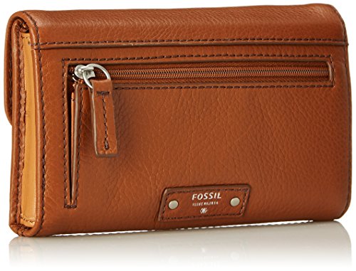 Mid-length wallet in pebbled leather featuring topstitching and front flap with leather-covered snap