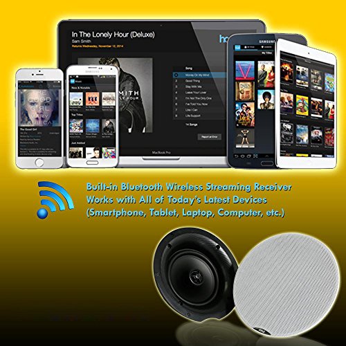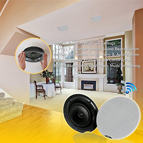 -. Binding : Electronics -. Brand : Pyle -. Color : Black -. EAN : 0068888772440 -. Feature : BLUETOOTH - Built-in Bluetooth no hassle wireless music streaming from all your favorite Bluetooth enabled devices. Perfect for incredible stereo sound in any room in your home from speakers you can barely see without using any floor or shelf space. / SPEAKER GRILL - Includes built in round stain resistant speaker grills. Match existing flush mounted designs in your home or workplace for a clean look & achieve wide-range sound performance without compromise. / SEAMLESS INTEGRATION - Perfect sound wherever you need it. Great for existing home theater systems and custom applications this Pyle 2-way in-ceiling or in-wall speaker system will deliver on-demand crisp audio sound clarity all the time. / FLUSH MOUNT DESIGN - Compact flush mount design for simple easy installation in-wall / in-ceiling , or pre-cut speaker openings, for in home use, office, professional, or custom audio applications on any flat surface. / EASY TO INSTALL - Includes a cut-out size template screw terminal block speaker connectors with ability to DAISY-CHAIN SPEAKERS for simple, easy, no hassle installation with included speaker connection wire, bluetooth Controller & power supply. -. Label : Sound Around -. Manufacturer : Sound Around -. Model : PDICBT67 -. MPN : PDICBT67 -. NumberOfItems : 1 -. PackageQuantity : 1 -. PartNumber : PDICBT67 -. ProductGroup : Speakers -. ProductTypeName : SPEAKERS -. Publisher : Sound Around -. Studio : Sound Around -. Title : Pyle Pair 6.5” Bluetooth Universal Flush Mount In-wall In-ceiling 2-Way Speaker System Dual Polypropylene Cone & Polymer Tweeter Stereo Sound 300 Watts (PDICBT67) -. UPC : 068888772440 -. Warranty : 1 Year Limited