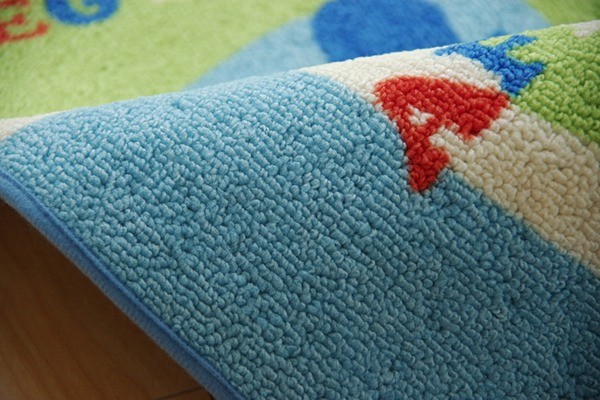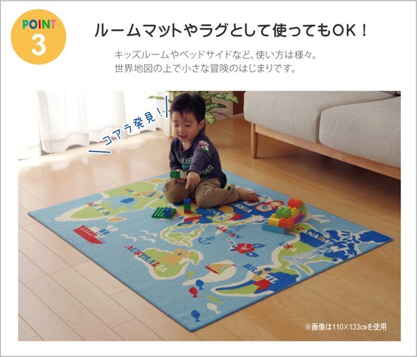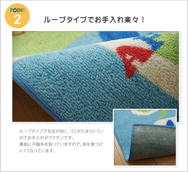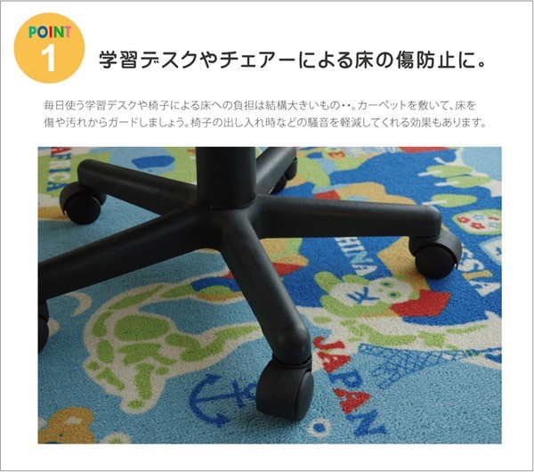 学習机用のデスクカーペットです。世界地図柄が特徴です。表地はループタイプになっており、毛足が短く掃除がしやすい仕様になっています。裏地には不織布を使用していますので、フローリングが傷つきにくいです。お子様の学習机の下や、ベッドサイドなどにお勧めの商品です。
