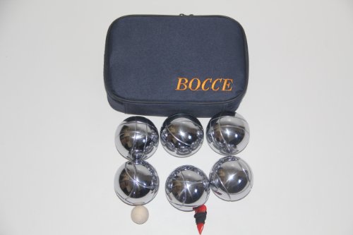 Product Description Bocce/Petanque set includes 6 silver balls with 2 different striping patterns, a blue bag, a wooden jack and a basic measuring device. 0