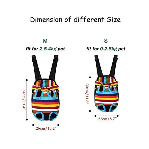 -. Feature : Pet travel carrier works fine, can let the pet with the owner of zero distance contact, it is easy to carry and safe to use. / Reflectors and bright colors for high visibility and safety; keep the pet's head and legs outside; adjustable back strap can reduce the burden. Strap widening design that make you much more comfortable to carry your pet. / The bag outside design with breathable mesh, is breathable and comfortable, a good dog carrier for you to choose. S size fits about 0-2.5 kg weight pets. / You can take your beloved dog together anywhere and anytime when you want with the dog front carrier/ dog backpack carrier. / Note: S size fits about 0-2.5 kg weight pets. The length of the S size dog carriers is 11.8 inches, you can reference the length of your pets. Pet carriers are specially designed for your lovely pet. With the help of this, you won't worry about losing your pet dog while going out. Small Size:11.8 x 8.7 x 5.1inch (L x W x Bottom Width), Flat Chest:17.3 inches.