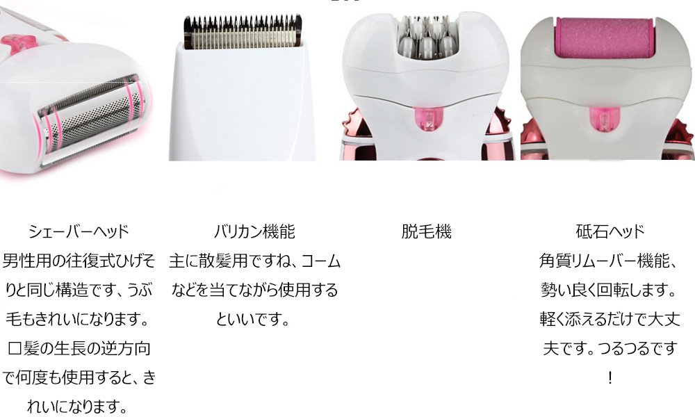 Includes: Main body, Epilation head, Shaver head, Hair clipper, Whetstone head, Adapter charger, Cleaning brush, Instruction manual (English & Japanese)