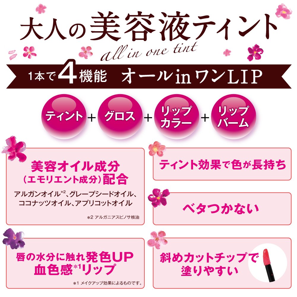「ティント」「グロス」「リップカラー」「リップバーム」が、1本で4役のオールインワンティントグロス。美容液成分90%配合で大人の唇もうるおいで満たす、プレミアムな"大人ティント"唇の水分に触れると発色UP。ベタつかず、ティント効果で色が長持ち。(※発色には個人差があります。)