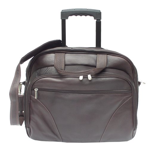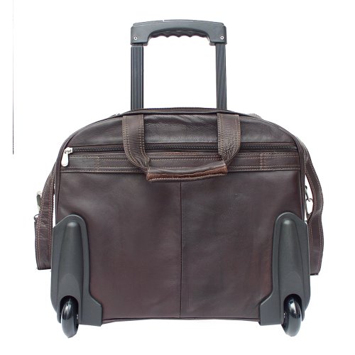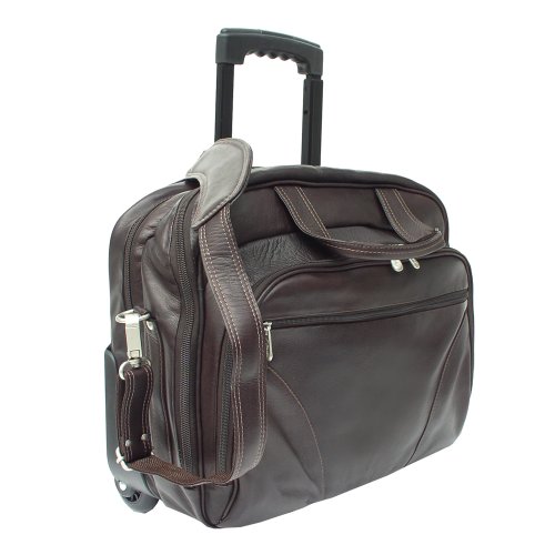 Studio : Piel Leather Publisher : Piel Leather Binding : Apparel Product Description Two large zip compartments, back zip compartment with a three section divider for files, front zip pocket with padded laptop pocket (15 inch x 12 inch x 2 inch) and additional storage space. Front pocket with full organizer, and a front and back zip-pocket. Telescopic handle, roller blade wheels, back strap to attach to a telescopic handle, double top handles for easy carrying and an adjustable/detachable shoulder strap. 0